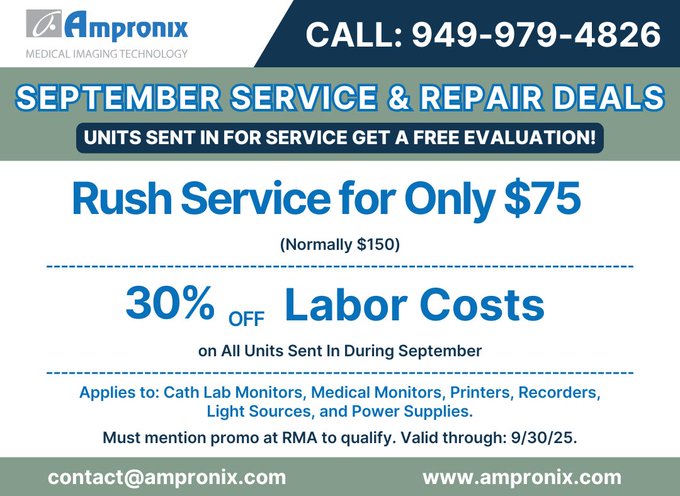 The Health Care Medical Industry's Service and Repair Center Facilities are seeing a significant growth in Medical Service Requests. This is due to many factors but mostly older technology is finally coming to EOL or end of life and is needing repair. Some companies are taking advantage of this such as California based Medical Manufacturer Ampronix with there factory certified Medical Service and Repair Department.